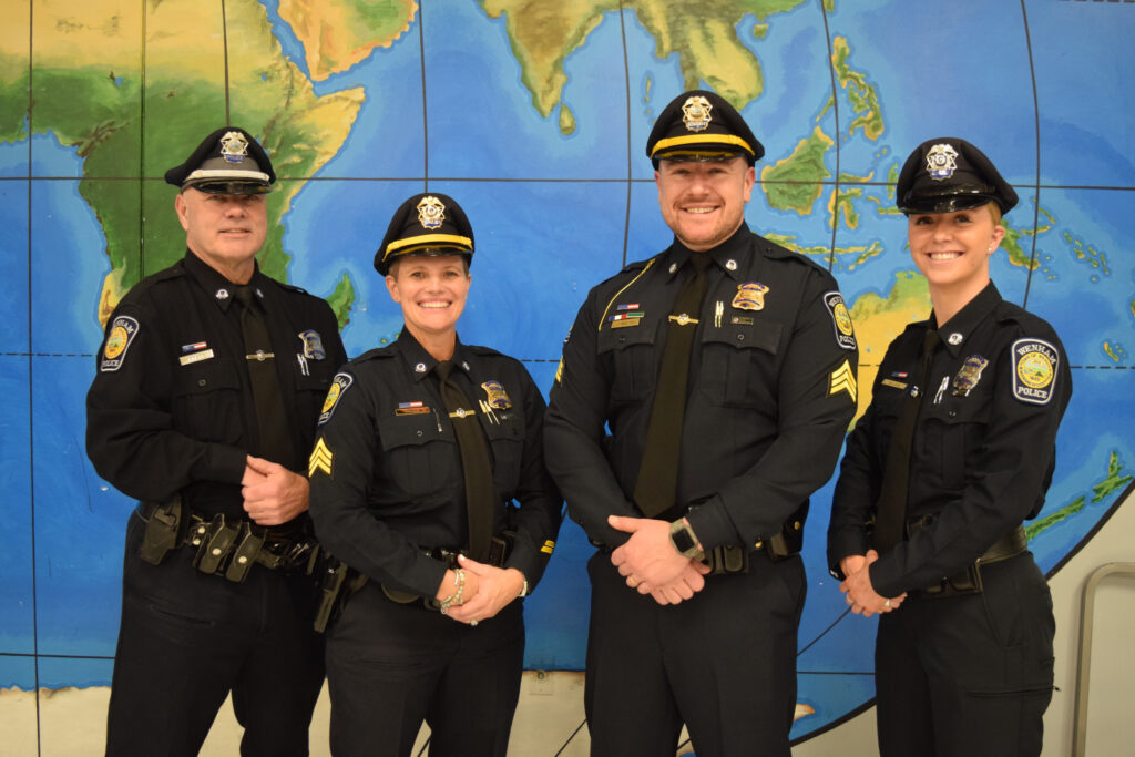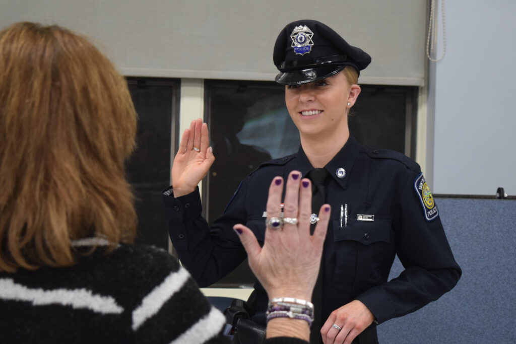 Officer Brian Pratt and Officer Marissa DeLucia were sworn in as new full-time police officers, while Officers Bart Connors and Michelle Princi were sworn in as new sergeants.