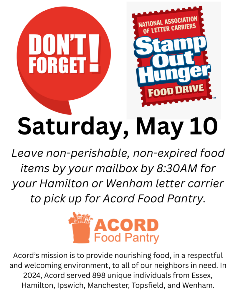 On this day, Wenham residents can put non-perishable food items by their mailbox by 8:30 a.m., and their letter carrier will pick them up to be donated to Acord Food Pantry. This is Acord’s biggest food drive and an important way to stock its shelves for the 900+ clients it serves yearly.
